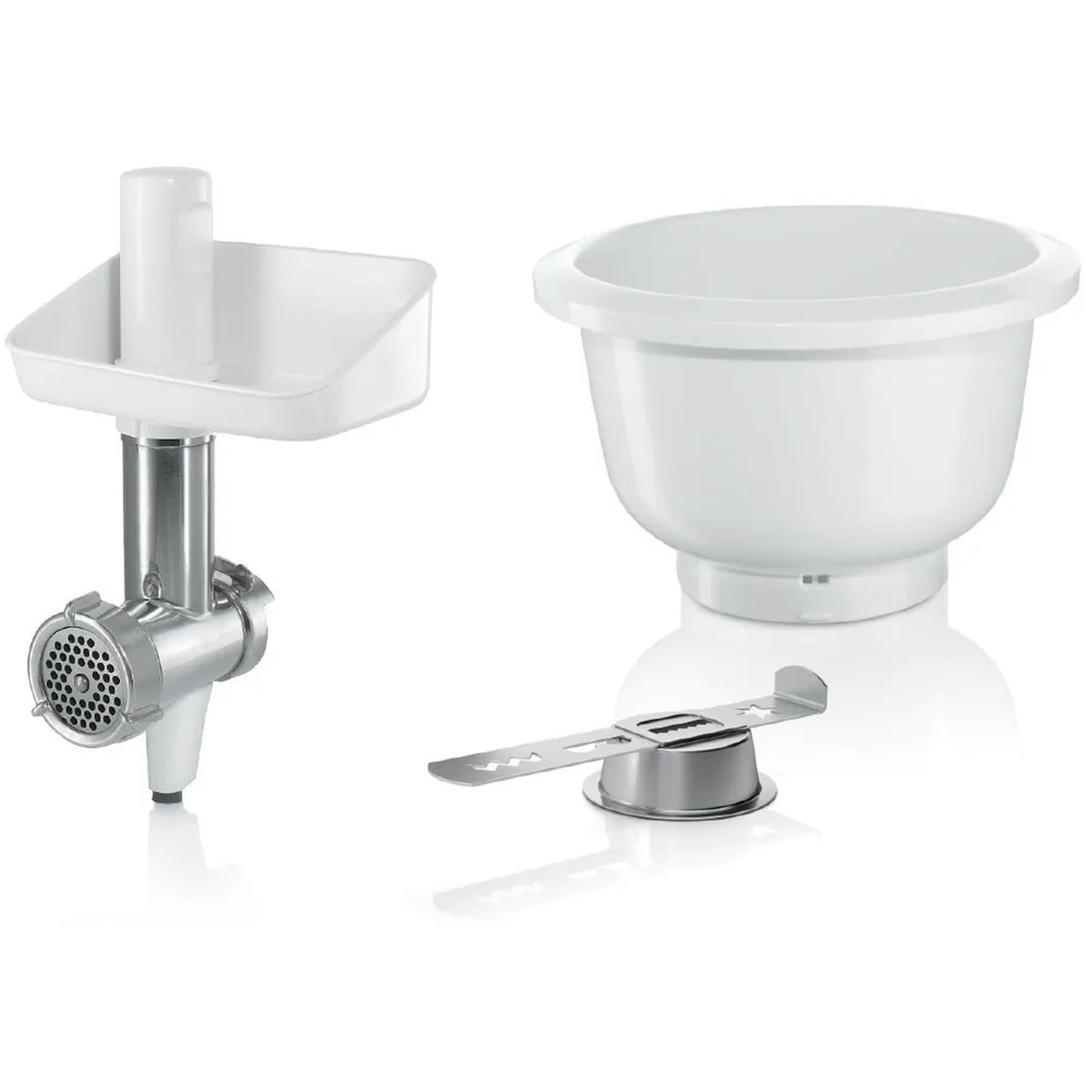 - Inhalt: Fleischwolf,Spritzgebäckvorsatz, (Durchmesser 4,5 mm), Messer, Einfüllschale und Stopfer, Kunststoff-Rührschüssel,